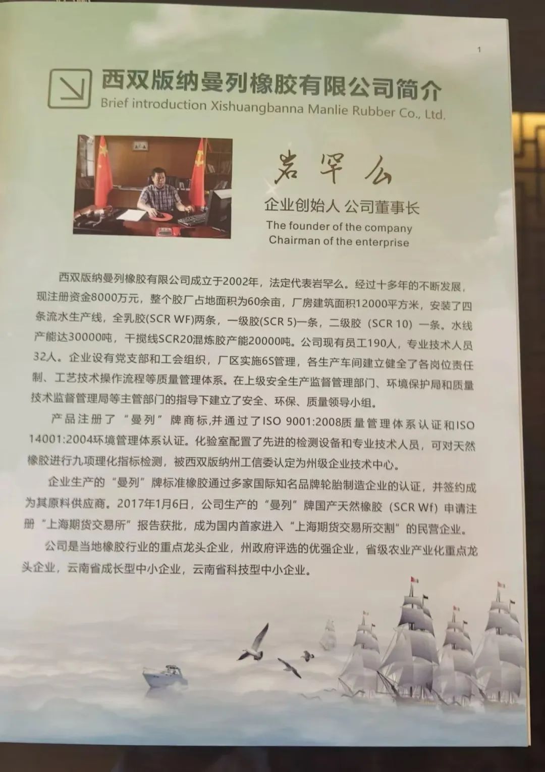 西双版纳曼列橡胶有限公司成立于2002年,法定代表岩罕么。经过十多年的不断发展,现注册资金8000万元,整个胶厂占地面积为60余亩,厂房建筑面积12000平方米,安装了四条流水生产线,全乳胶(SCR WF)两条,一级胶(SCR5)一条,二级胶(SCR10)一条。水线产能达30000吨,干搅线SCR20混炼胶产能20000吨。